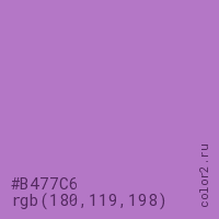 Цвет #B477C6 в цветовой модели RGB обозначается тремя октетами (180, 119, 198) в десятичном формате и #B477C6 в шестнадцатиричном (hex) формате, которые являются интенсивностью красного 180 (hex B4), интенсивность зелёного 119 (hex 77) и интенсивность синего 198 (hex C6).