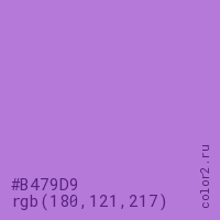 Цвет #B479D9 в цветовой модели RGB обозначается тремя октетами (180, 121, 217) в десятичном формате и #B479D9 в шестнадцатиричном (hex) формате, которые являются интенсивностью красного 180 (hex B4), интенсивность зелёного 121 (hex 79) и интенсивность синего 217 (hex D9).