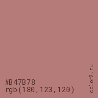 Цвет #B47B78 в цветовой модели RGB обозначается тремя октетами (180, 123, 120) в десятичном формате и #B47B78 в шестнадцатиричном (hex) формате, которые являются интенсивностью красного 180 (hex B4), интенсивность зелёного 123 (hex 7B) и интенсивность синего 120 (hex 78).