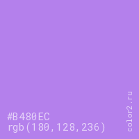 Цвет #B480EC в цветовой модели RGB обозначается тремя октетами (180, 128, 236) в десятичном формате и #B480EC в шестнадцатиричном (hex) формате, которые являются интенсивностью красного 180 (hex B4), интенсивность зелёного 128 (hex 80) и интенсивность синего 236 (hex EC).