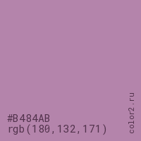 Цвет #B484AB в цветовой модели RGB обозначается тремя октетами (180, 132, 171) в десятичном формате и #B484AB в шестнадцатиричном (hex) формате, которые являются интенсивностью красного 180 (hex B4), интенсивность зелёного 132 (hex 84) и интенсивность синего 171 (hex AB).