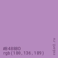 Цвет #B488BD в цветовой модели RGB обозначается тремя октетами (180, 136, 189) в десятичном формате и #B488BD в шестнадцатиричном (hex) формате, которые являются интенсивностью красного 180 (hex B4), интенсивность зелёного 136 (hex 88) и интенсивность синего 189 (hex BD).