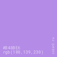 Цвет #B48BE6 в цветовой модели RGB обозначается тремя октетами (180, 139, 230) в десятичном формате и #B48BE6 в шестнадцатиричном (hex) формате, которые являются интенсивностью красного 180 (hex B4), интенсивность зелёного 139 (hex 8B) и интенсивность синего 230 (hex E6).