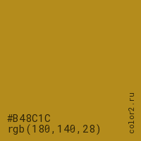 Цвет #B48C1C в цветовой модели RGB обозначается тремя октетами (180, 140, 28) в десятичном формате и #B48C1C в шестнадцатиричном (hex) формате, которые являются интенсивностью красного 180 (hex B4), интенсивность зелёного 140 (hex 8C) и интенсивность синего 28 (hex 1C).