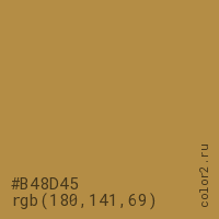 Цвет #B48D45 в цветовой модели RGB обозначается тремя октетами (180, 141, 69) в десятичном формате и #B48D45 в шестнадцатиричном (hex) формате, которые являются интенсивностью красного 180 (hex B4), интенсивность зелёного 141 (hex 8D) и интенсивность синего 69 (hex 45).