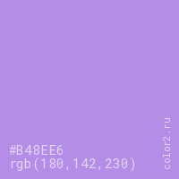 Цвет #B48EE6 в цветовой модели RGB обозначается тремя октетами (180, 142, 230) в десятичном формате и #B48EE6 в шестнадцатиричном (hex) формате, которые являются интенсивностью красного 180 (hex B4), интенсивность зелёного 142 (hex 8E) и интенсивность синего 230 (hex E6).