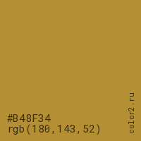 Цвет #B48F34 в цветовой модели RGB обозначается тремя октетами (180, 143, 52) в десятичном формате и #B48F34 в шестнадцатиричном (hex) формате, которые являются интенсивностью красного 180 (hex B4), интенсивность зелёного 143 (hex 8F) и интенсивность синего 52 (hex 34).