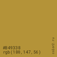 Цвет #B49338 в цветовой модели RGB обозначается тремя октетами (180, 147, 56) в десятичном формате и #B49338 в шестнадцатиричном (hex) формате, которые являются интенсивностью красного 180 (hex B4), интенсивность зелёного 147 (hex 93) и интенсивность синего 56 (hex 38).