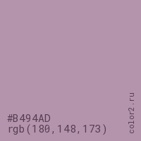 Цвет #B494AD в цветовой модели RGB обозначается тремя октетами (180, 148, 173) в десятичном формате и #B494AD в шестнадцатиричном (hex) формате, которые являются интенсивностью красного 180 (hex B4), интенсивность зелёного 148 (hex 94) и интенсивность синего 173 (hex AD).