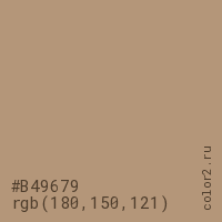 Цвет #B49679 в цветовой модели RGB обозначается тремя октетами (180, 150, 121) в десятичном формате и #B49679 в шестнадцатиричном (hex) формате, которые являются интенсивностью красного 180 (hex B4), интенсивность зелёного 150 (hex 96) и интенсивность синего 121 (hex 79).