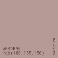 Цвет #B49B96 в цветовой модели RGB обозначается тремя октетами (180, 155, 150) в десятичном формате и #B49B96 в шестнадцатиричном (hex) формате, которые являются интенсивностью красного 180 (hex B4), интенсивность зелёного 155 (hex 9B) и интенсивность синего 150 (hex 96).