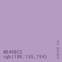 Цвет #B49BC2 в цветовой модели RGB обозначается тремя октетами (180, 155, 194) в десятичном формате и #B49BC2 в шестнадцатиричном (hex) формате, которые являются интенсивностью красного 180 (hex B4), интенсивность зелёного 155 (hex 9B) и интенсивность синего 194 (hex C2).