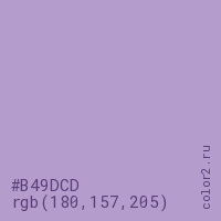 Цвет #B49DCD в цветовой модели RGB обозначается тремя октетами (180, 157, 205) в десятичном формате и #B49DCD в шестнадцатиричном (hex) формате, которые являются интенсивностью красного 180 (hex B4), интенсивность зелёного 157 (hex 9D) и интенсивность синего 205 (hex CD).