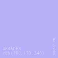 Цвет #B4ADF8 в цветовой модели RGB обозначается тремя октетами (180, 173, 248) в десятичном формате и #B4ADF8 в шестнадцатиричном (hex) формате, которые являются интенсивностью красного 180 (hex B4), интенсивность зелёного 173 (hex AD) и интенсивность синего 248 (hex F8).