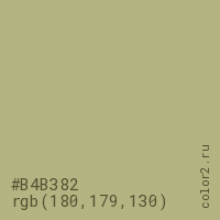 Цвет #B4B382 в цветовой модели RGB обозначается тремя октетами (180, 179, 130) в десятичном формате и #B4B382 в шестнадцатиричном (hex) формате, которые являются интенсивностью красного 180 (hex B4), интенсивность зелёного 179 (hex B3) и интенсивность синего 130 (hex 82).
