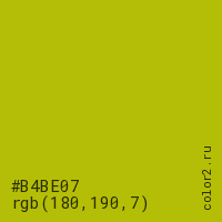Цвет #B4BE07 в цветовой модели RGB обозначается тремя октетами (180, 190, 7) в десятичном формате и #B4BE07 в шестнадцатиричном (hex) формате, которые являются интенсивностью красного 180 (hex B4), интенсивность зелёного 190 (hex BE) и интенсивность синего 7 (hex 07).