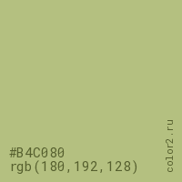 Цвет #B4C080 в цветовой модели RGB обозначается тремя октетами (180, 192, 128) в десятичном формате и #B4C080 в шестнадцатиричном (hex) формате, которые являются интенсивностью красного 180 (hex B4), интенсивность зелёного 192 (hex C0) и интенсивность синего 128 (hex 80).
