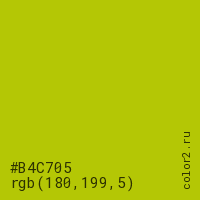 Цвет #B4C705 в цветовой модели RGB обозначается тремя октетами (180, 199, 5) в десятичном формате и #B4C705 в шестнадцатиричном (hex) формате, которые являются интенсивностью красного 180 (hex B4), интенсивность зелёного 199 (hex C7) и интенсивность синего 5 (hex 05).
