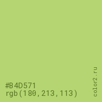 Цвет #B4D571 в цветовой модели RGB обозначается тремя октетами (180, 213, 113) в десятичном формате и #B4D571 в шестнадцатиричном (hex) формате, которые являются интенсивностью красного 180 (hex B4), интенсивность зелёного 213 (hex D5) и интенсивность синего 113 (hex 71).