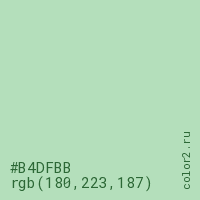 Цвет #B4DFBB в цветовой модели RGB обозначается тремя октетами (180, 223, 187) в десятичном формате и #B4DFBB в шестнадцатиричном (hex) формате, которые являются интенсивностью красного 180 (hex B4), интенсивность зелёного 223 (hex DF) и интенсивность синего 187 (hex BB).