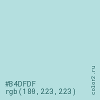 Цвет #B4DFDF в цветовой модели RGB обозначается тремя октетами (180, 223, 223) в десятичном формате и #B4DFDF в шестнадцатиричном (hex) формате, которые являются интенсивностью красного 180 (hex B4), интенсивность зелёного 223 (hex DF) и интенсивность синего 223 (hex DF).