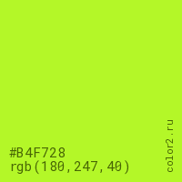 Цвет #B4F728 в цветовой модели RGB обозначается тремя октетами (180, 247, 40) в десятичном формате и #B4F728 в шестнадцатиричном (hex) формате, которые являются интенсивностью красного 180 (hex B4), интенсивность зелёного 247 (hex F7) и интенсивность синего 40 (hex 28).