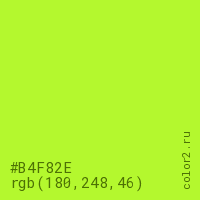 Цвет #B4F82E в цветовой модели RGB обозначается тремя октетами (180, 248, 46) в десятичном формате и #B4F82E в шестнадцатиричном (hex) формате, которые являются интенсивностью красного 180 (hex B4), интенсивность зелёного 248 (hex F8) и интенсивность синего 46 (hex 2E).