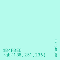 Цвет #B4FBEC в цветовой модели RGB обозначается тремя октетами (180, 251, 236) в десятичном формате и #B4FBEC в шестнадцатиричном (hex) формате, которые являются интенсивностью красного 180 (hex B4), интенсивность зелёного 251 (hex FB) и интенсивность синего 236 (hex EC).