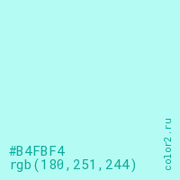 Цвет #B4FBF4 в цветовой модели RGB обозначается тремя октетами (180, 251, 244) в десятичном формате и #B4FBF4 в шестнадцатиричном (hex) формате, которые являются интенсивностью красного 180 (hex B4), интенсивность зелёного 251 (hex FB) и интенсивность синего 244 (hex F4).