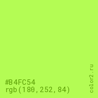 Цвет #B4FC54 в цветовой модели RGB обозначается тремя октетами (180, 252, 84) в десятичном формате и #B4FC54 в шестнадцатиричном (hex) формате, которые являются интенсивностью красного 180 (hex B4), интенсивность зелёного 252 (hex FC) и интенсивность синего 84 (hex 54).