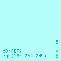 Цвет #B4FEF9 в цветовой модели RGB обозначается тремя октетами (180, 254, 249) в десятичном формате и #B4FEF9 в шестнадцатиричном (hex) формате, которые являются интенсивностью красного 180 (hex B4), интенсивность зелёного 254 (hex FE) и интенсивность синего 249 (hex F9).