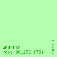 Цвет #B4FFAF в цветовой модели RGB обозначается тремя октетами (180, 255, 175) в десятичном формате и #B4FFAF в шестнадцатиричном (hex) формате, которые являются интенсивностью красного 180 (hex B4), интенсивность зелёного 255 (hex FF) и интенсивность синего 175 (hex AF).
