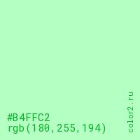 Цвет #B4FFC2 в цветовой модели RGB обозначается тремя октетами (180, 255, 194) в десятичном формате и #B4FFC2 в шестнадцатиричном (hex) формате, которые являются интенсивностью красного 180 (hex B4), интенсивность зелёного 255 (hex FF) и интенсивность синего 194 (hex C2).
