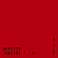 Цвет #B5010E в цветовой модели RGB обозначается тремя октетами (181, 1, 14) в десятичном формате и #B5010E в шестнадцатиричном (hex) формате, которые являются интенсивностью красного 181 (hex B5), интенсивность зелёного 1 (hex 01) и интенсивность синего 14 (hex 0E).