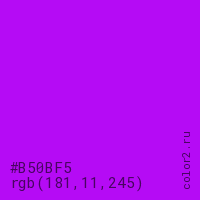 Цвет #B50BF5 в цветовой модели RGB обозначается тремя октетами (181, 11, 245) в десятичном формате и #B50BF5 в шестнадцатиричном (hex) формате, которые являются интенсивностью красного 181 (hex B5), интенсивность зелёного 11 (hex 0B) и интенсивность синего 245 (hex F5).