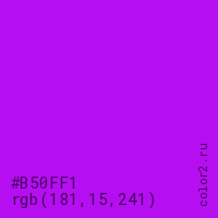 Цвет #B50FF1 в цветовой модели RGB обозначается тремя октетами (181, 15, 241) в десятичном формате и #B50FF1 в шестнадцатиричном (hex) формате, которые являются интенсивностью красного 181 (hex B5), интенсивность зелёного 15 (hex 0F) и интенсивность синего 241 (hex F1).