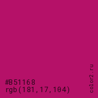 Цвет #B51168 в цветовой модели RGB обозначается тремя октетами (181, 17, 104) в десятичном формате и #B51168 в шестнадцатиричном (hex) формате, которые являются интенсивностью красного 181 (hex B5), интенсивность зелёного 17 (hex 11) и интенсивность синего 104 (hex 68).