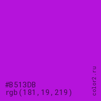 Цвет #B513DB в цветовой модели RGB обозначается тремя октетами (181, 19, 219) в десятичном формате и #B513DB в шестнадцатиричном (hex) формате, которые являются интенсивностью красного 181 (hex B5), интенсивность зелёного 19 (hex 13) и интенсивность синего 219 (hex DB).