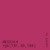 Цвет #B53264 в цветовой модели RGB обозначается тремя октетами (181, 50, 100) в десятичном формате и #B53264 в шестнадцатиричном (hex) формате, которые являются интенсивностью красного 181 (hex B5), интенсивность зелёного 50 (hex 32) и интенсивность синего 100 (hex 64).