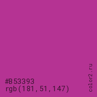 Цвет #B53393 в цветовой модели RGB обозначается тремя октетами (181, 51, 147) в десятичном формате и #B53393 в шестнадцатиричном (hex) формате, которые являются интенсивностью красного 181 (hex B5), интенсивность зелёного 51 (hex 33) и интенсивность синего 147 (hex 93).