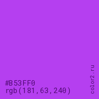 Цвет #B53FF0 в цветовой модели RGB обозначается тремя октетами (181, 63, 240) в десятичном формате и #B53FF0 в шестнадцатиричном (hex) формате, которые являются интенсивностью красного 181 (hex B5), интенсивность зелёного 63 (hex 3F) и интенсивность синего 240 (hex F0).