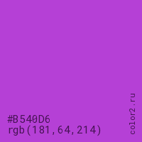 Цвет #B540D6 в цветовой модели RGB обозначается тремя октетами (181, 64, 214) в десятичном формате и #B540D6 в шестнадцатиричном (hex) формате, которые являются интенсивностью красного 181 (hex B5), интенсивность зелёного 64 (hex 40) и интенсивность синего 214 (hex D6).