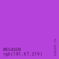 Цвет RGB(181, 67, 219) в процентом отношении количества цвета состоит из 71% красного (red), 26.3% зелёного (green) и 85.9% синего (blue).