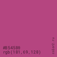 Цвет #B54580 в цветовой модели RGB обозначается тремя октетами (181, 69, 128) в десятичном формате и #B54580 в шестнадцатиричном (hex) формате, которые являются интенсивностью красного 181 (hex B5), интенсивность зелёного 69 (hex 45) и интенсивность синего 128 (hex 80).