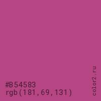 Цвет #B54583 в цветовой модели RGB обозначается тремя октетами (181, 69, 131) в десятичном формате и #B54583 в шестнадцатиричном (hex) формате, которые являются интенсивностью красного 181 (hex B5), интенсивность зелёного 69 (hex 45) и интенсивность синего 131 (hex 83).