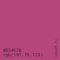 Цвет #B5467B в цветовой модели RGB обозначается тремя октетами (181, 70, 123) в десятичном формате и #B5467B в шестнадцатиричном (hex) формате, которые являются интенсивностью красного 181 (hex B5), интенсивность зелёного 70 (hex 46) и интенсивность синего 123 (hex 7B).