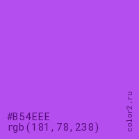 Цвет #B54EEE в цветовой модели RGB обозначается тремя октетами (181, 78, 238) в десятичном формате и #B54EEE в шестнадцатиричном (hex) формате, которые являются интенсивностью красного 181 (hex B5), интенсивность зелёного 78 (hex 4E) и интенсивность синего 238 (hex EE).