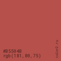 Цвет #B5504B в цветовой модели RGB обозначается тремя октетами (181, 80, 75) в десятичном формате и #B5504B в шестнадцатиричном (hex) формате, которые являются интенсивностью красного 181 (hex B5), интенсивность зелёного 80 (hex 50) и интенсивность синего 75 (hex 4B).