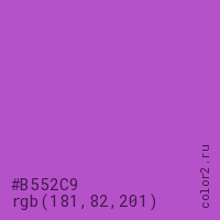 Цвет #B552C9 в цветовой модели RGB обозначается тремя октетами (181, 82, 201) в десятичном формате и #B552C9 в шестнадцатиричном (hex) формате, которые являются интенсивностью красного 181 (hex B5), интенсивность зелёного 82 (hex 52) и интенсивность синего 201 (hex C9).