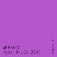 Цвет #B556CC в цветовой модели RGB обозначается тремя октетами (181, 86, 204) в десятичном формате и #B556CC в шестнадцатиричном (hex) формате, которые являются интенсивностью красного 181 (hex B5), интенсивность зелёного 86 (hex 56) и интенсивность синего 204 (hex CC).